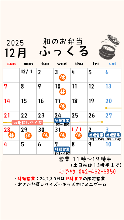 →12月28日(日)~1月1日(木)までお休み(その他、時短営業の日あり)