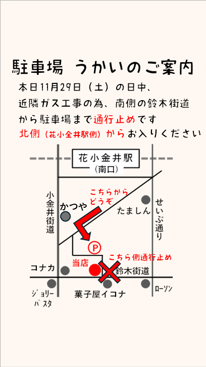 南側(鈴木街道)からは通行止め、北側(花小金井駅側)からお入りくださいますようお願い申し上げます